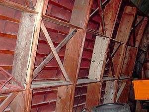 Das Grundelement des Systems JBL ist ein leicht zu transportierender und einfach zu montierender Rahmen von ca. 1 x 2 m. Die montierten Rahmen werden mit seitlich angeschlagenen Brettern (grau) verstärkt und das ganze Paket am Schluss mit Stahlstangen verschraubt. Die Stabilität der Struktur ergibt sich erst im fertig montierten Zustand, indem die senkrechten Hölzer sich zu Bindern fügen (rot), und die diagonalen Verstrebungen netzartig die Konstruktion aussteifen (blau).