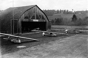 | Der Bider-Hangar entstand 1928 für den Berner Flugsport-Club als erstes Gebäude auf dem 1929 eröffneten Flugplatz Bern-Belpmoos. |